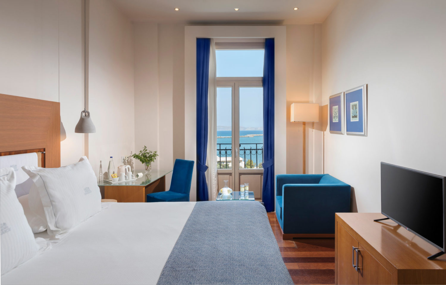 Κάθε ένα από τα είκοσι Executive δωμάτια με θέα στο Αιγαίο που υπάρχουν στο GDM Megaron, είναι μοναδικά σχεδιασμένα, 24 – 28 τετραγωνικών μέτρων με ξύλινο δάπεδο.